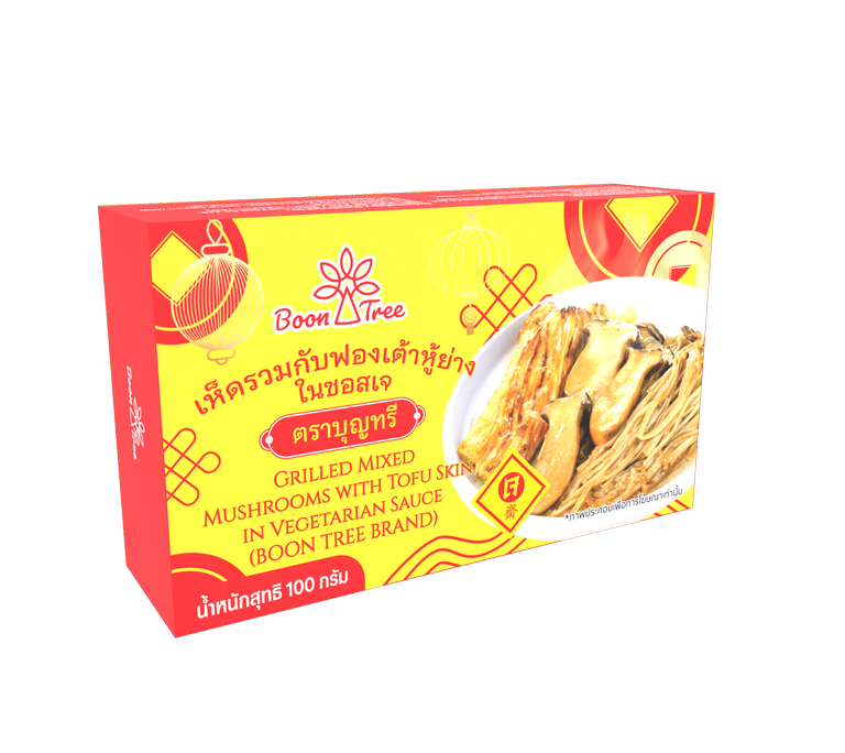 เห็ดรวมกับฟองเต้าหู้ย่างในซอสเจ Grilled Mixed Mushrooms with Tofu Skin in Vegetarian Sauce 100 กรัม
